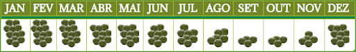 The Tahiti lime has the peculiarity of being green and seedless. It normally has a thin bark, with a smooth surface. The diameter of the fruit may vary from 45 to 65 mm and this variety is rich in juice, becoming a great option when making juice, in drinks and several gastronomic recipes with salads, meat, fish and desserts. The annual production calendar can be seen in the image below: